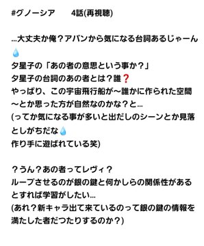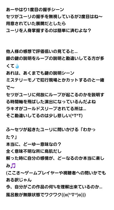 ・明かされるループの謎人狼×ノベゲ×ロジ… セツがループの話詳しく言わなかった理由が… ・セツのグノ顔、かっこよすぎるでもこれは… ・SQちゃんの箱入り娘、ジナのみたらし団… ・議論中の夕里子様の振る舞い、美しいだけ… ・開幕「お前が凍れ」発言の由里子、黒幕か… にやっと返せたなぁとスッキリゆりこさん意… ループの目的と銀の鍵の仕様、原作のゲーム… 夕里子まじ夕里子だったわ…持ってた電子扇… ラキオくんすぐ凍らされて愛おしいねアニメ…